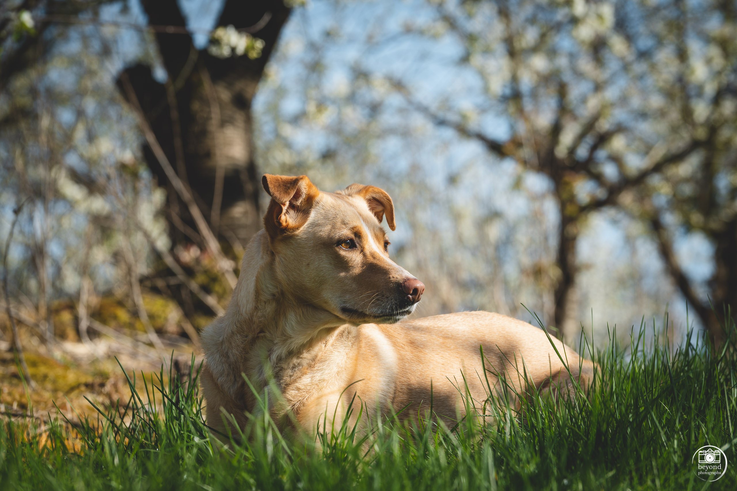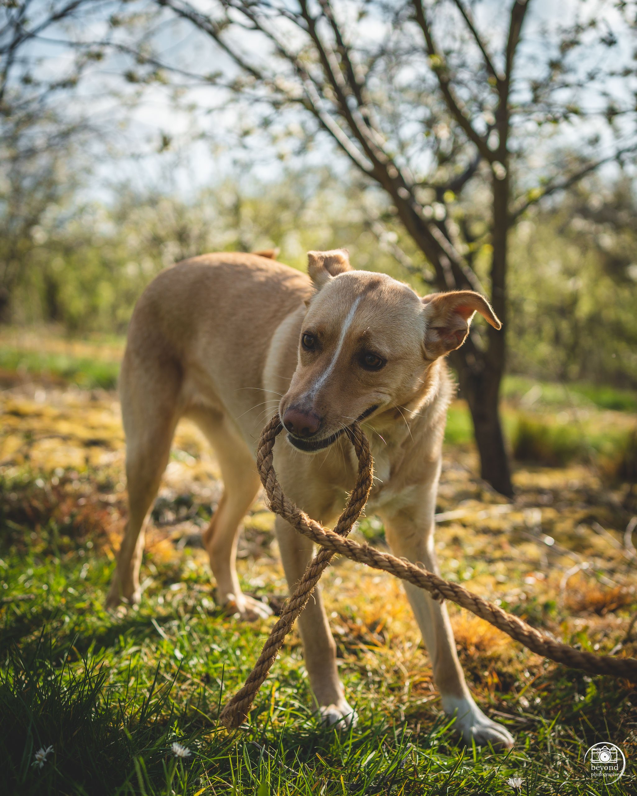 Het bijzondere aan buitenfotografie voor honden is hoe ze reageren op hun omgeving. Terwijl Flory ronddartelde tussen de bloesems, legden we haar spontane, kwispelende vreugde vast – een herinnering aan de pure speelsheid van de lente.