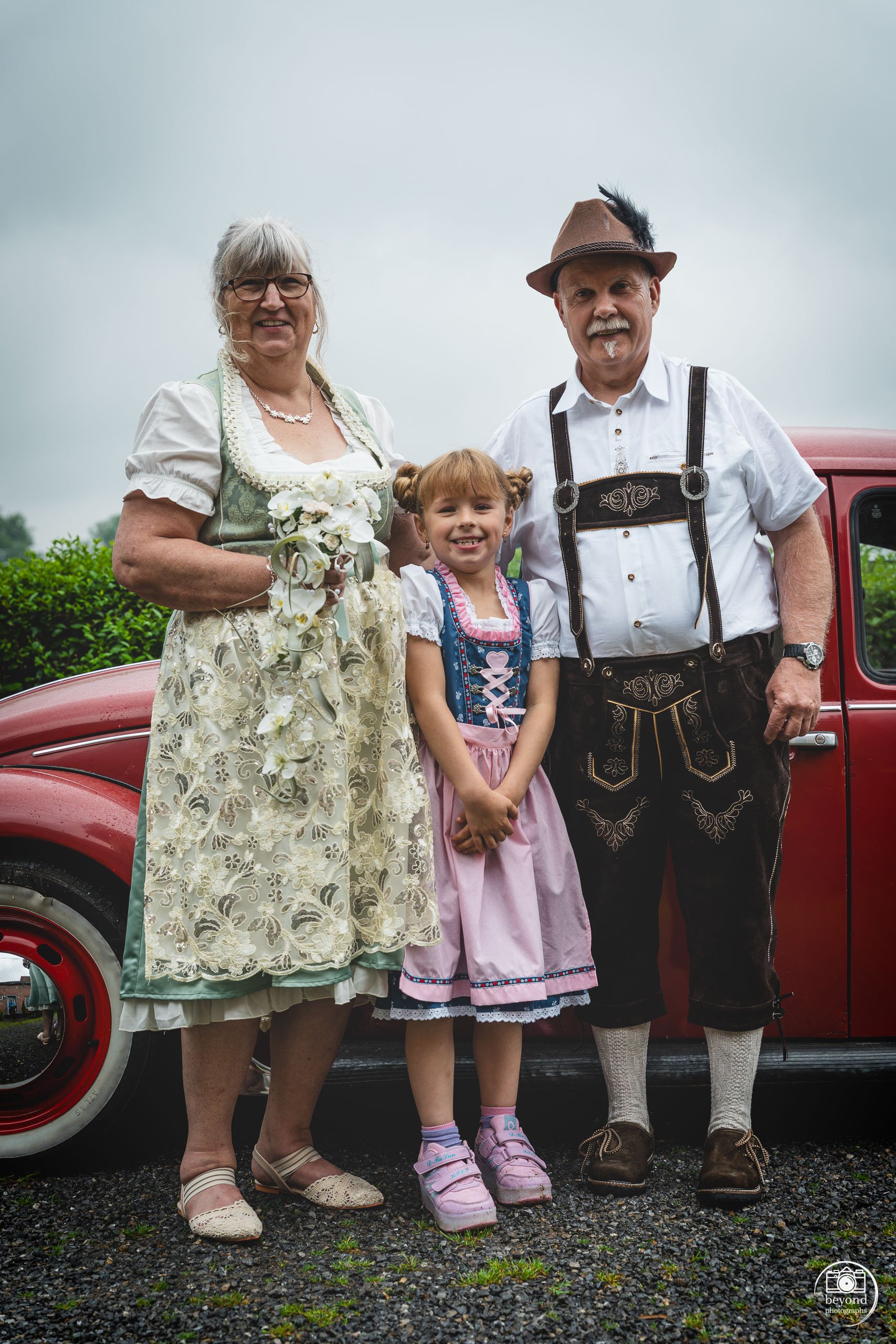 Naast de schattige pony’s speelde ook een iconische oude VW Beetle een hoofdrol in hun trouwreportage. Deze prachtige wagen paste perfect bij de authentieke stijl van de dag en gaf de foto’s een extra vleugje nostalgie. In de zachte regen glansde de auto nog meer – en zorgde voor romantische, filmische beelden.