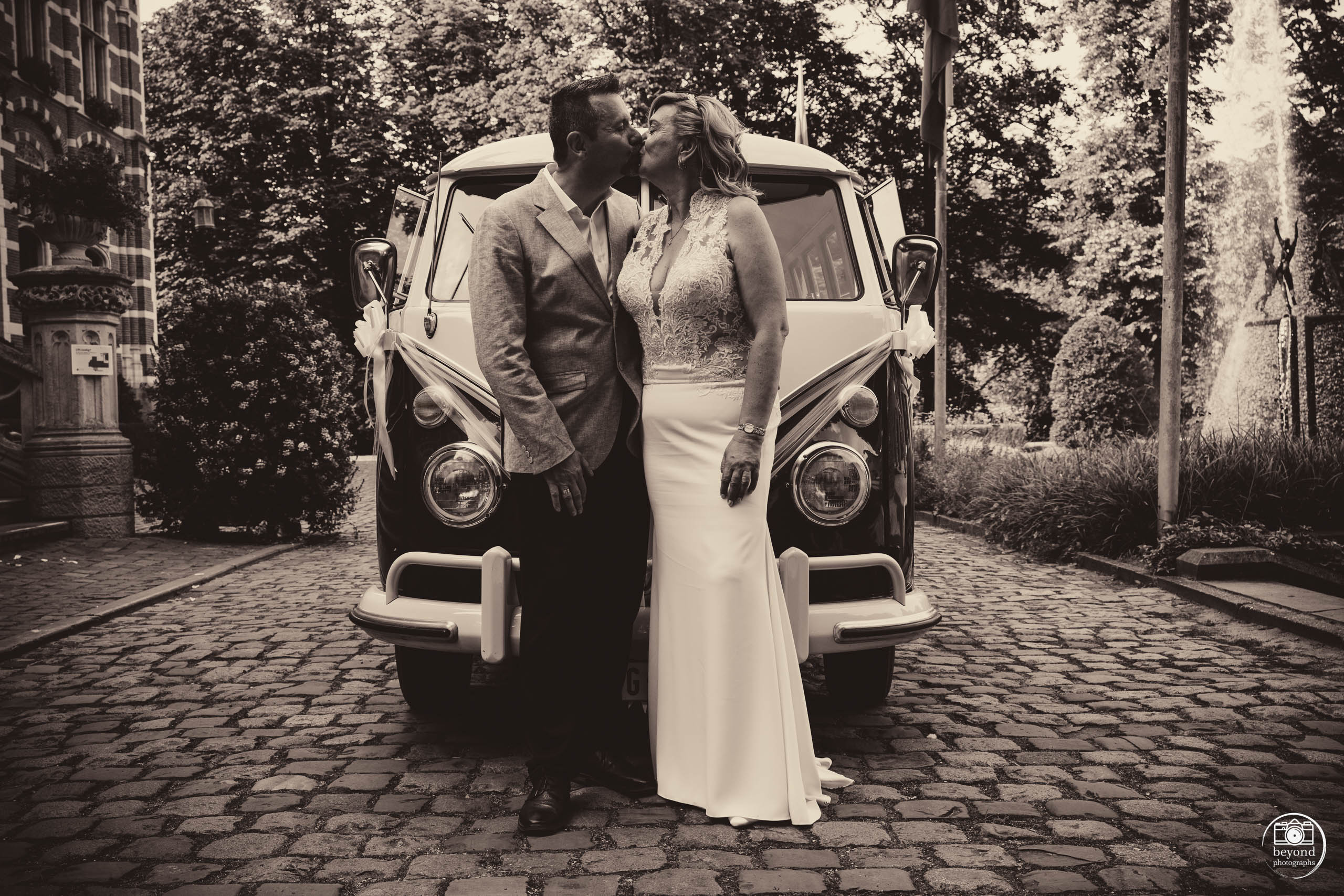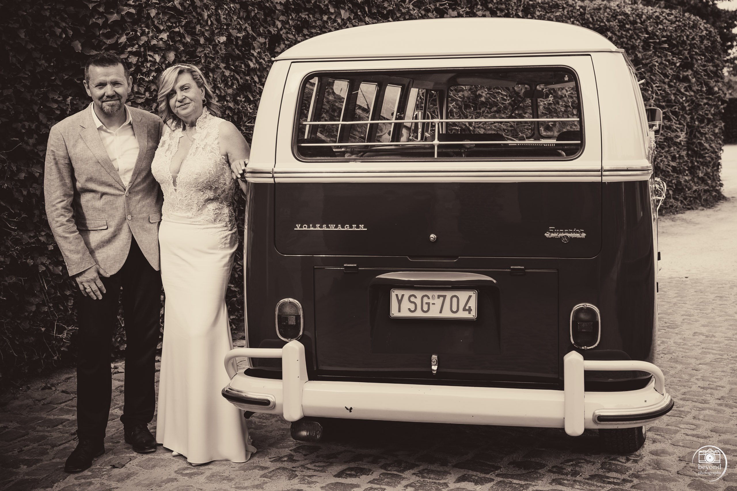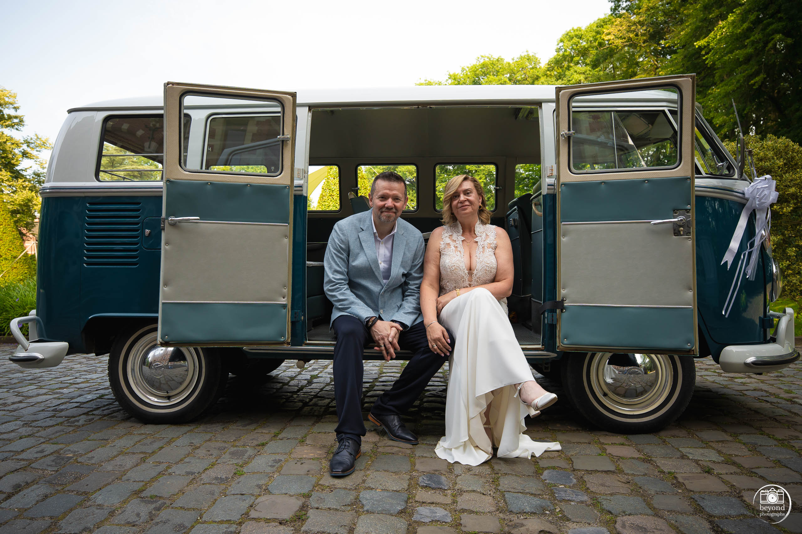 We leerden Anja en Johny kennen op een vorig huwelijk, waar hij als DJ de sfeer erin bracht en wij als fotografen elk bijzonder moment vastlegden. Toen we lachend zeiden: Als je nog een fotograaf zoekt…", was zijn antwoord resoluut: "We hebben er al één!" Maar het lot besloot anders: door onverwachte omstandigheden werd hun fotograaf ziek, en zo mochten wij alsnog hun trouwreportage met VW T1 in beeld brengen.